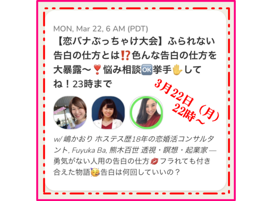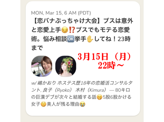 2021/03/22恋バナぶっちゃけ大会! 毎週月曜、22時~clubhouseにて配信中 本日は、こちらから↓ 【恋バナぶっちゃけ大会】ふられない告白の仕方とは⁉️色んな... -
