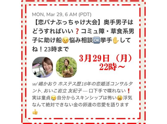 2021/03/293月26日(月)22時~clubhouseにて https://www.joinclubhouse.com/event/mZNL6dXQ 奥手男子の相談にのります! でも、本当に聞いてほしいのは 女性の皆さ... -