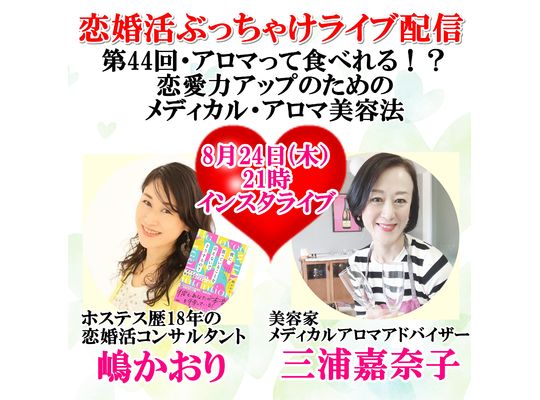 2023/08/03さてさて! 今月のインスタライブ 恋婚活ぶっちゃけライブ配信は~? 8月24日(木)21時~ 第44回 アロマって食べれる!? 恋愛力UPのためのメディカ...