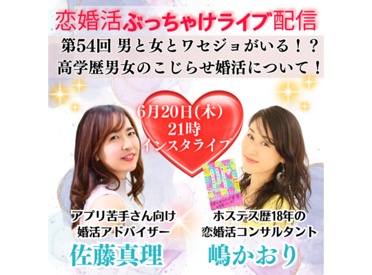 2024/06/07さてさて! 今月のインスタライブ 恋婚活ぶっちゃけライブ配信は~? 6月20日(木)21時~ 第54回 男と女とワセジョがいる!高学歴男女のこじらせ婚... -