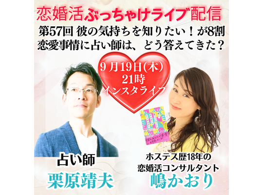 2024/09/05さてさて! 今月のインスタライブ 恋婚活ぶっちゃけライブ配信は~? 9月19日(木)21時~ 第57回 彼の気持ちを知りたい!が8割 恋愛事情に占い師は、... -