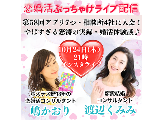 2024/10/05さてさて! 今月のインスタライブ 恋婚活ぶっちゃけライブ配信は~? 10月24日(木)21時~ 第58回 アプリ7つ・相談所4社に入会!ヤバすぎる実録・婚活... -